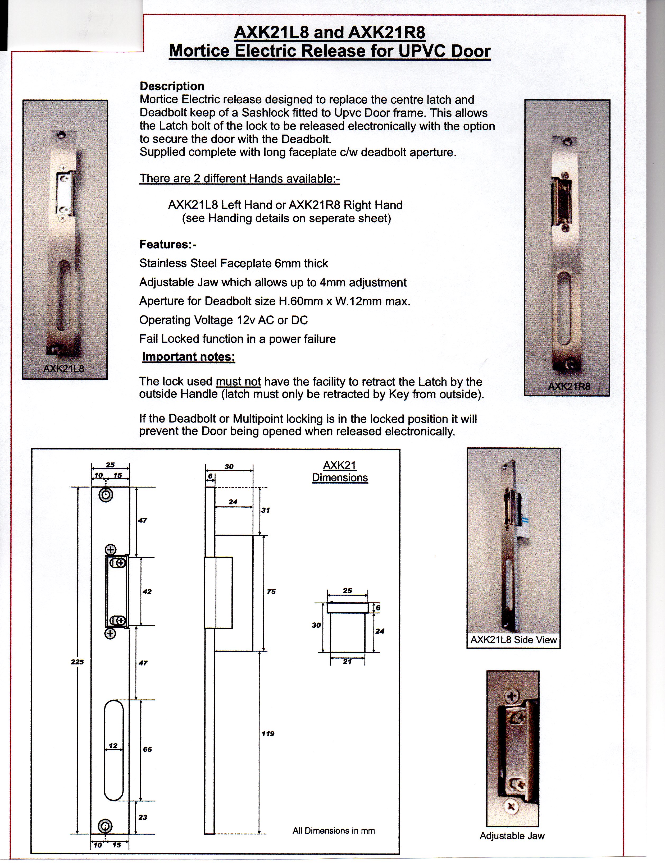 - Adjustable Jaw which allows up to 4mm adjustment perture for Deadbolt size H.60mm x W.12mm max.